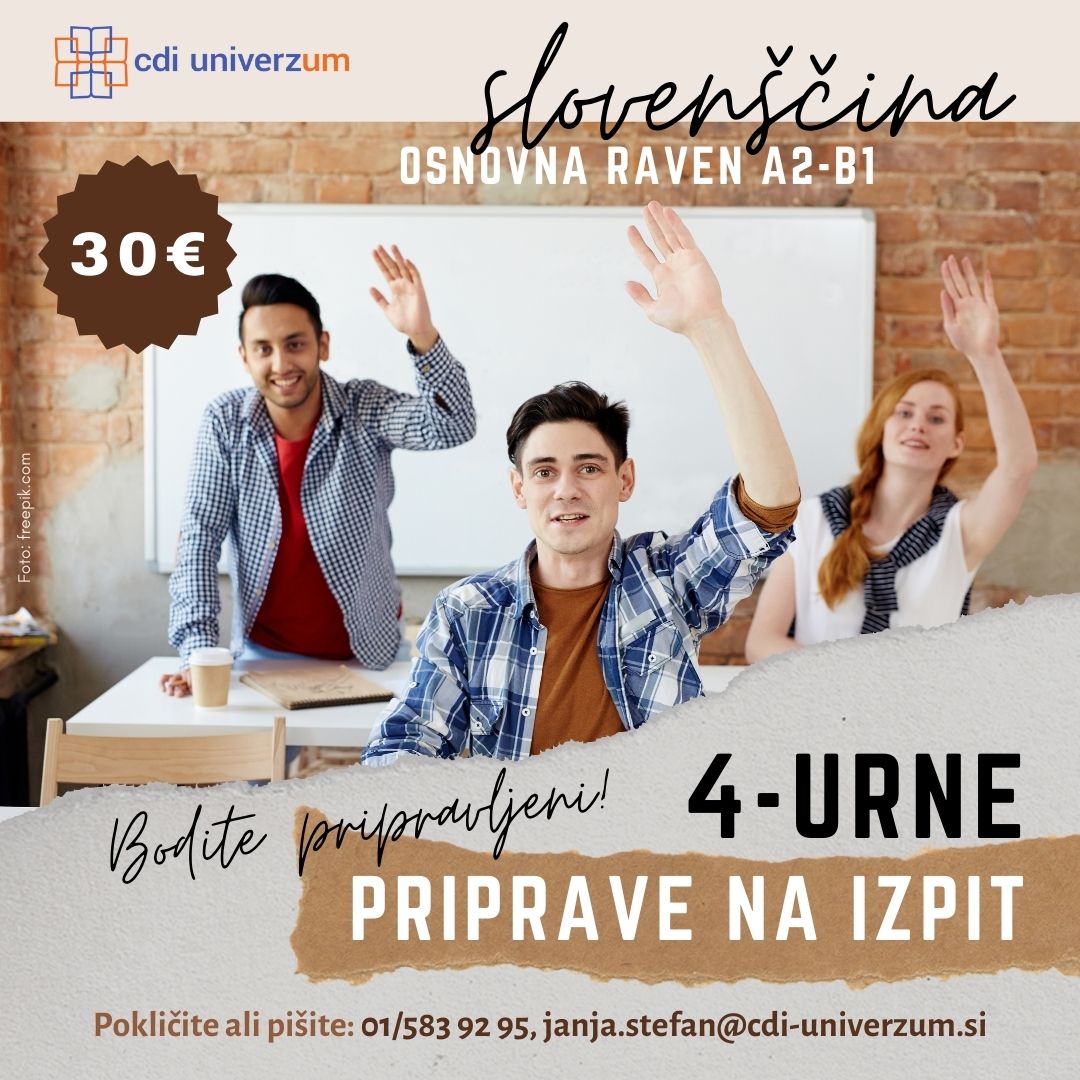 Priprave na izpit iz znanja slovenščine na OSNOVNI RAVNI A2-B1 (4 ure); Termin priprav: 7. 4. 2026 in 2. 6. 2026